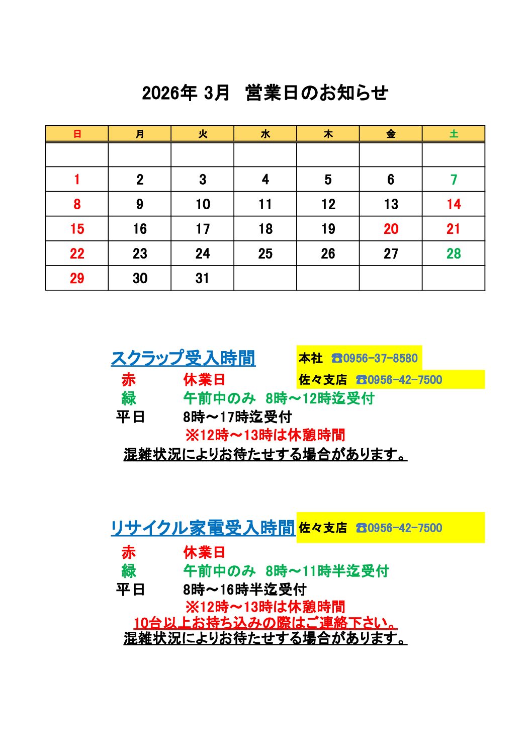 3月営業日のお知らせです。